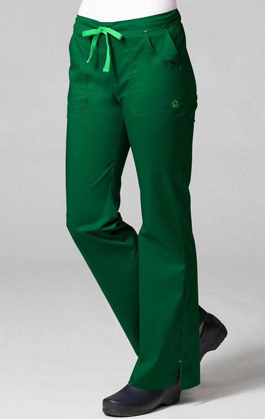 Designed with our signature stretch fabric that is soft to the touch, yet crisp and professional. Fashion flare pant with back elastic waist. Triple stitching at waist and pockets. Four front slash pockets and one back pocket. High quality contrast colored twill tape drawstring. Contrast bartacks at all pressure point. Vented hems for added mobility. SIZES: XS - 2XL. INSEAM: Reg: 31" Petite: 28". FABRIC: 52% Cotton 45% Polyester 3% Spandex.