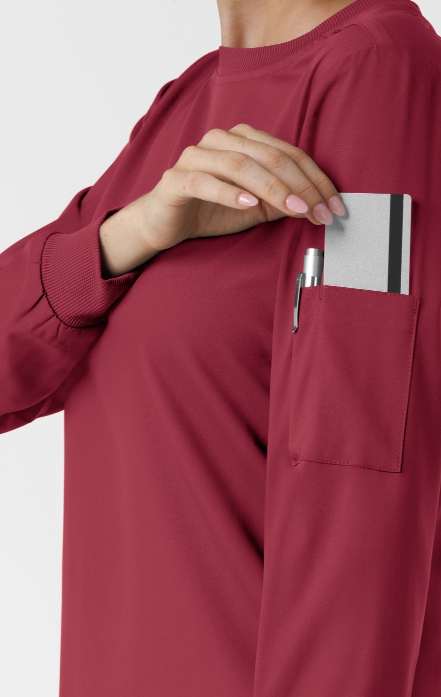 Reach for this women's long sleeve scrub top, your new go-to for any shift. Versatile enough to wear alone or layered, it adapts to your needs. It features a modern fit that skims the body for comfort and a professional look. Made with a polyester blend fabric that includes recycled materials, it's a sustainable choice that's soft on your skin and kinder to the planet. Stay organized with a convenient sleeve pen slot and card pocket on the sleeve. The ribbed crewneck features badge loops on the shoulders so your ID is always clearly visible and at the ready. The innovative ribbed Glove Assist cuffs make glove changes faster and smoother than ever, a small detail that makes a big difference in your busy day. The high-low hem adds coverage as you bend, twist, and reach. Made for comfort, practicality, and a touch of sustainability, this scrub top is designed to support you through every patient and every task.