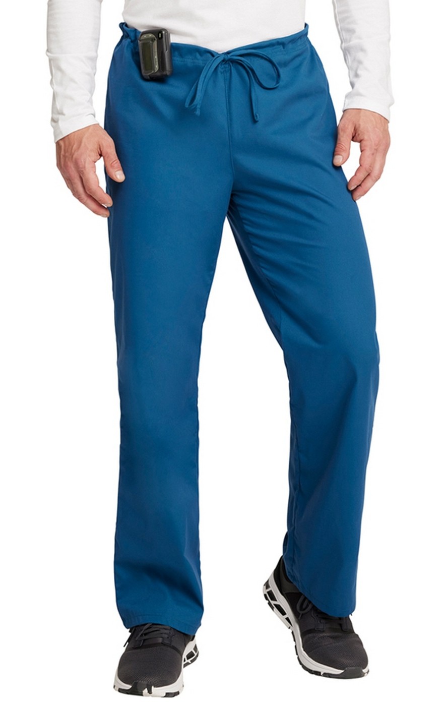 Unisex fit, natural rise pant features an adjustable drawstring with Dickies logo twill tape on the inside back waistband. Also featured is a back pocket with a stretch Galaxy Blue knit interior pocket (White knit pocket on White).