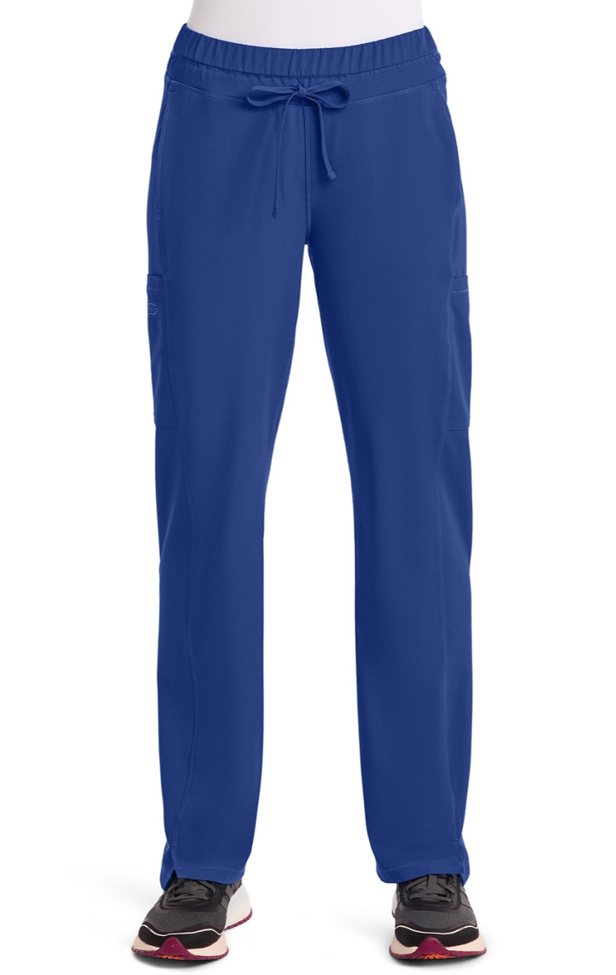 This contemporary fit, mid rise, straight leg pant features an elastic waistband with functional drawstring, in-seam pockets, cargo pockets, zip-closure back pocket at the yoke, side panels, side vents and coverstitch detail throughout.