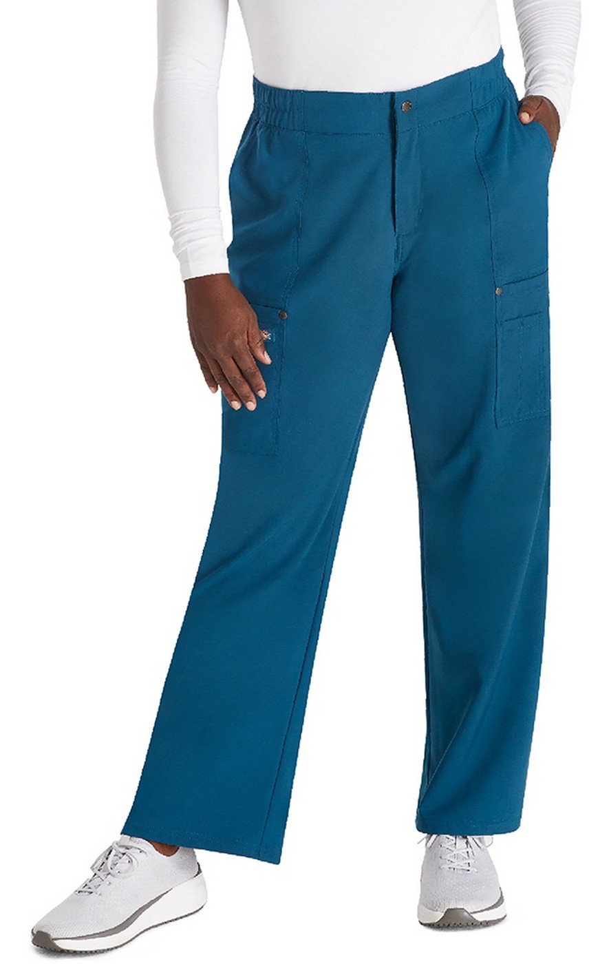 Fashion and function merge in this Contemporary fit mid rise pant. Flat front waistband with multi-needle stitching. Waistband is reinforced with elastic and includes logo inside drawstring for security and adjustability. Zip fly with logo snap closure. There are five pockets for organized storage: two front pockets, two cargo pockets with decorative logo snaps at corners, and one multi-slot instrument holder layered on the left cargo pocket. Decorative topstitching on all seams for added detailing. Logo locker loop at center back waist for quick hanging.