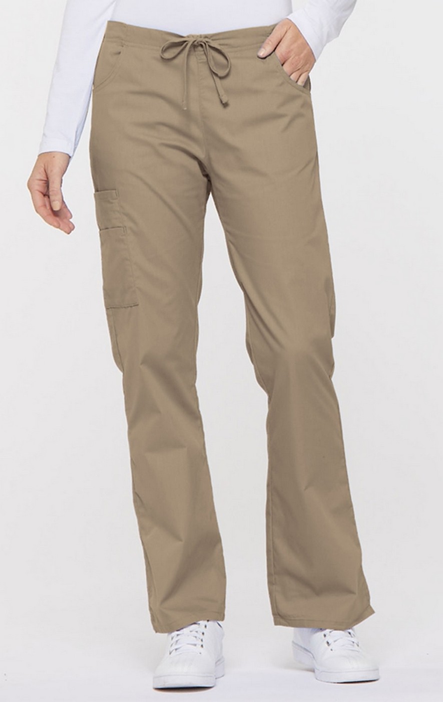 A modern classic fit, mid rise, moderate flare leg pant features an adjustable drawstring with elastic at the back waist and Dickies logo twill tape on the inside back waistband. Also featured are front scoop pockets, a back pocket, cargo pockets with a stretch Red knit interior pocket (White knit pocket on White) and side vents.