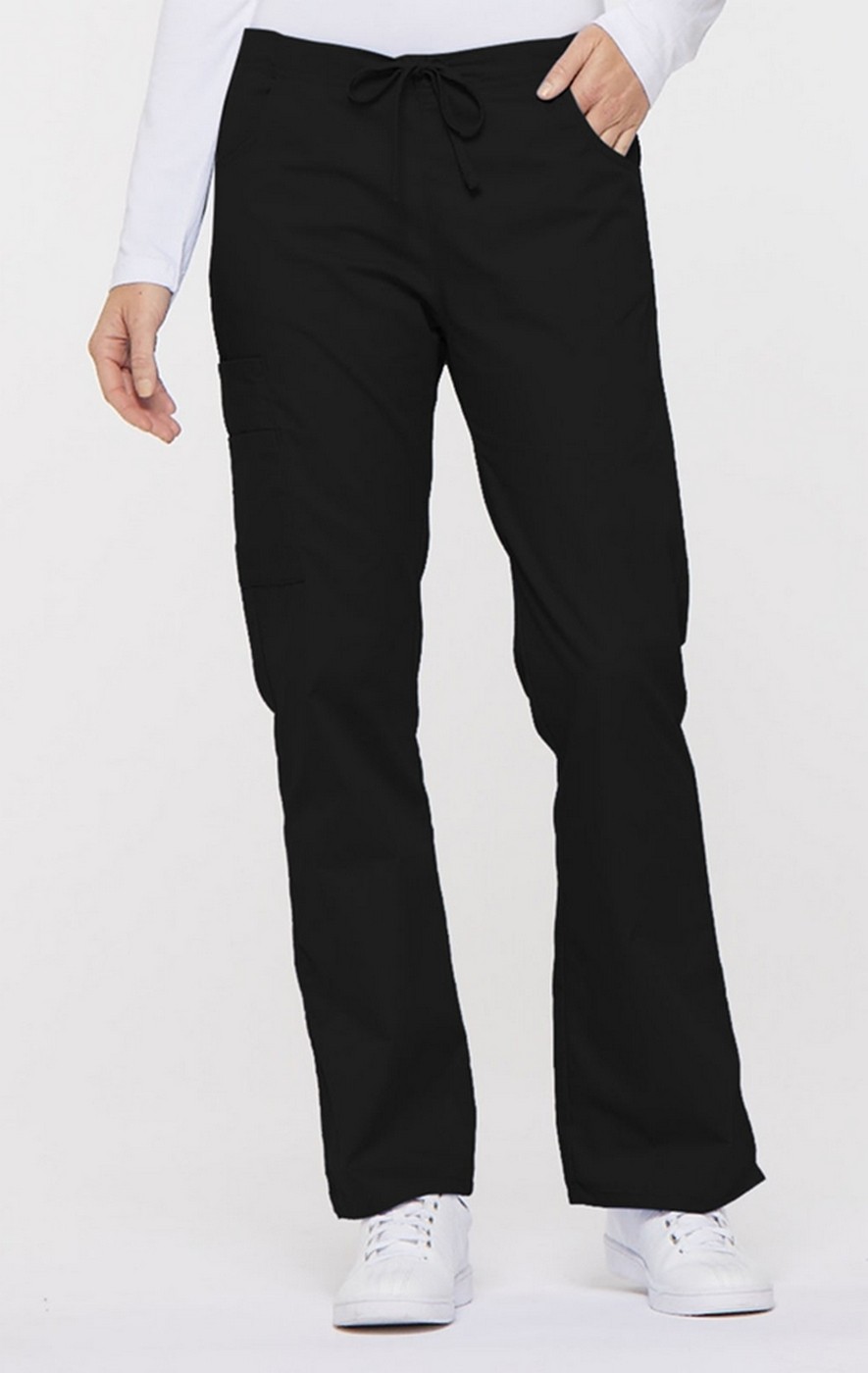 A modern classic fit, mid rise, moderate flare leg pant features an adjustable drawstring with elastic at the back waist and Dickies logo twill tape on the inside back waistband. Also featured are front scoop pockets, a back pocket, cargo pockets with a stretch Red knit interior pocket (White knit pocket on White) and side vents.