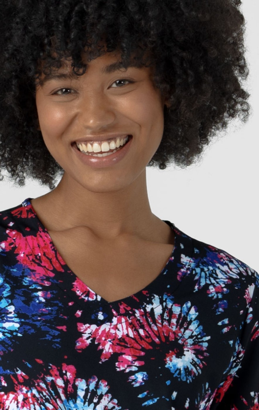 This WINK Women’s V-Neck Border Print Top has a flattering curved v-neck that complements the neckline perfectly. This print scrub top sits comfortably on the body with a classic women’s fit that isn’t tight or unshapely. The two roomy welt pockets sit flush blending into the print like invisible pockets. Made with side vents for ease of movement, this polyester/spandex v-neck scrub top is comfortable, durable and a great option if you are wanting to add fashionable prints to your medical scrubs uniform.