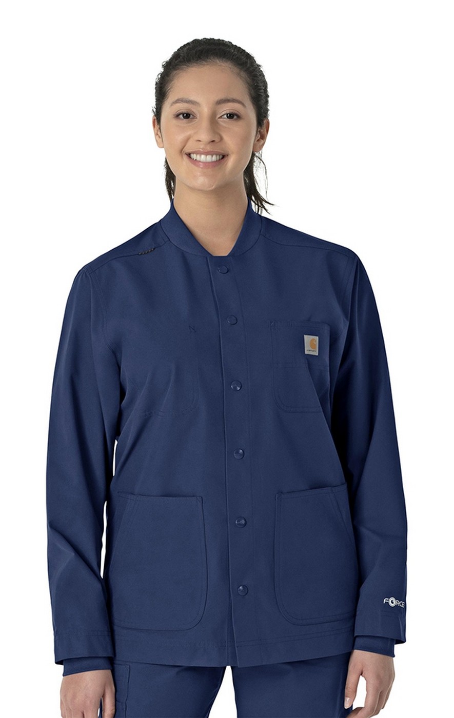 Stay comfortable as you check off every item on your workday to-do list in this Carhartt chore coat. Part of the Force Essentials collection, it's designed with technologies that help you to perform at your very best on the job. It's made of lightweight, durable fabric and cut for a modern fit that's not too tight and not too loose. Rugged Flex® stretch technology offers built-in stretch that allows you to reach the top shelf of the supply cabinet or help turn patients. Sweat-wicking and quick-drying, the coat helps you feel fresh from the beginning of your shift to the end. Stain-resistant technology keeps it looking good for seasons to come. A snap-button closure gives it a polished, professional look. Multiple functional pockets include a chest pocket with a pen slot, two top-load pockets, side entry pockets, an accessory loop inside the left pocket, and one interior full size top pocket.