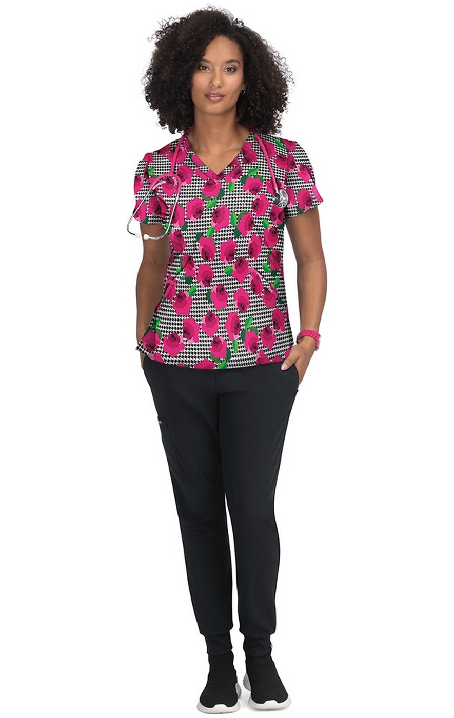 F101PR French Bull by koi Doll V-Neck Print Scrub Top - Houndstooth Rose