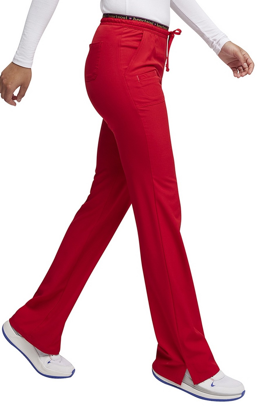 A Contemporary fit, low rise, flare leg pant has raised HeartSoul logo elastic all around waist, a functional drawstring and rounded patch pockets, including a small welt pocket with pink bar tacks. Also featured is an exterior pink bungee loop, a rounded back pocket for additional storage and side vents.