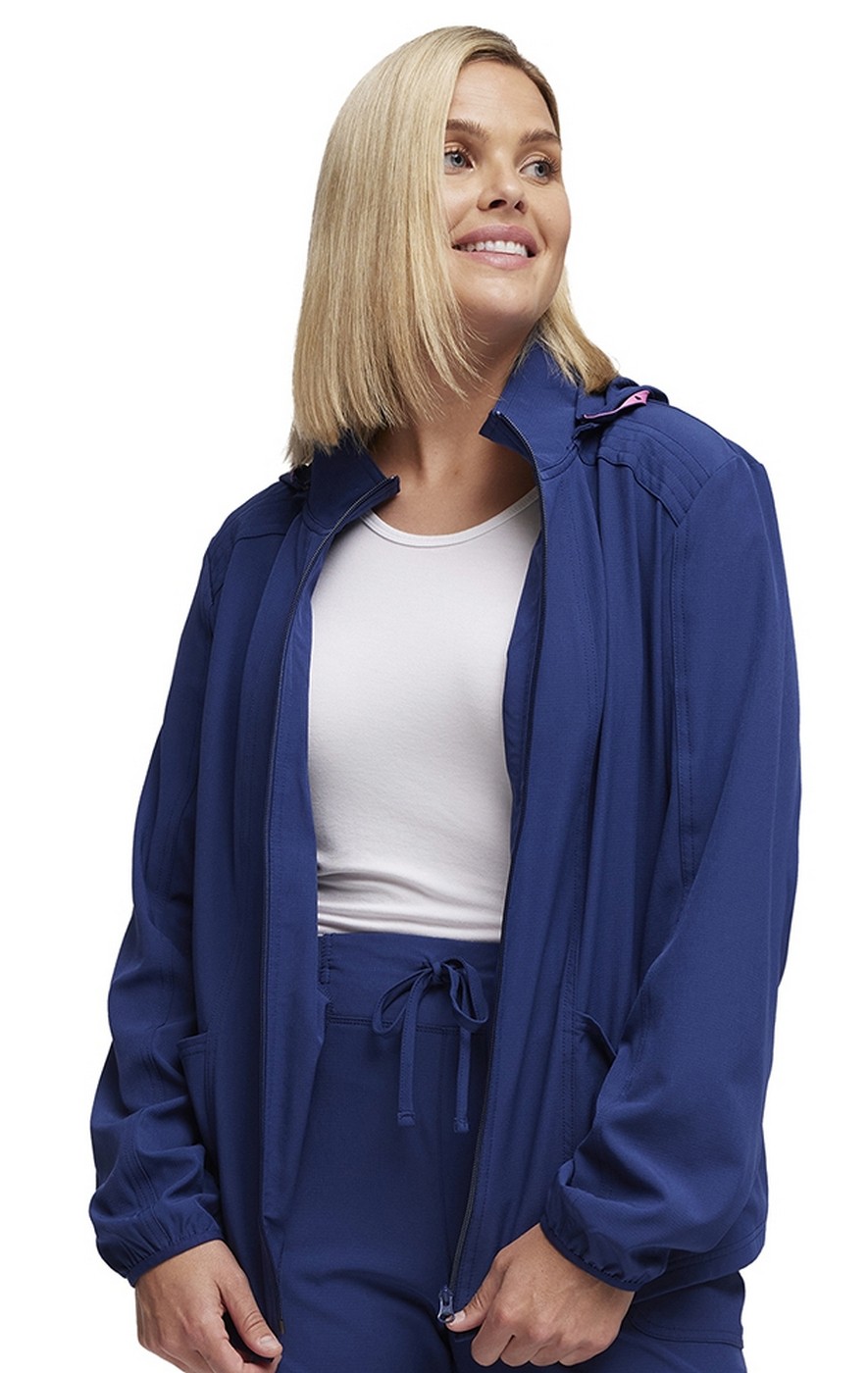 A Contemporary fit, zip front warm-up jacket has a detachable hood, front and back princess seams, patch pockets and an outer welt pocket with signature pink contrast bar tacks. Also featured are a hidden pink grommet and bungee loop for headphone cable management, an exterior pink bungee loop, signature woven tape at the back neck and hood edge and elastic binding at the sleeve hem.