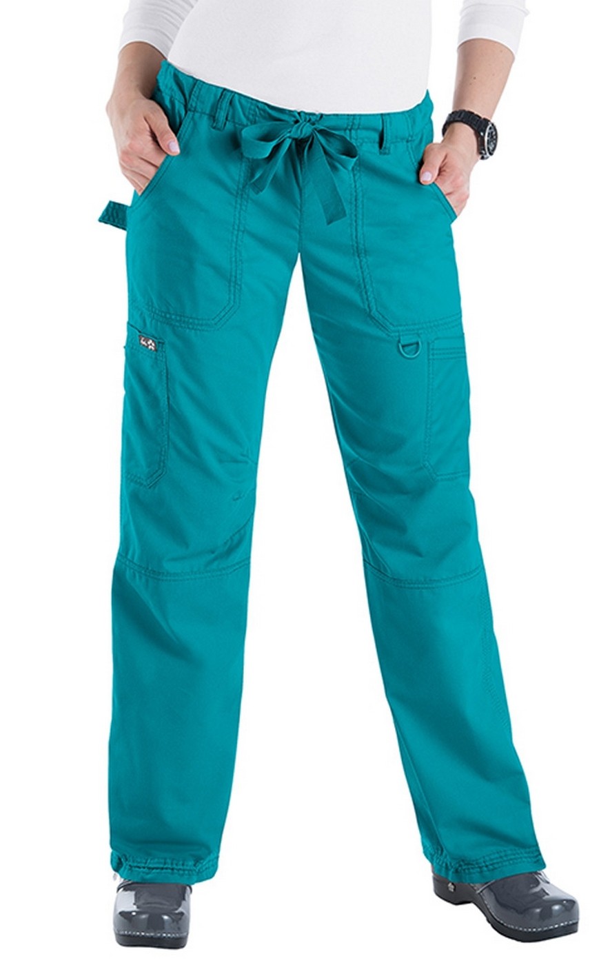 Koi has put a new twist on an old favorite! The koi Scrubs Lindsey low-rise cargo pant sits just below the waist and features an elasticized drawstring waistband. The boot cut leg also has an inside drawcord at the bottom of the hem for a customizable fit. There are two front pockets, two large cargo pockets and two back flap pockets providing ample storage. Both top stitch detail and fashion key loops are added touches of details that make these pants a must have for your scrub collection.
