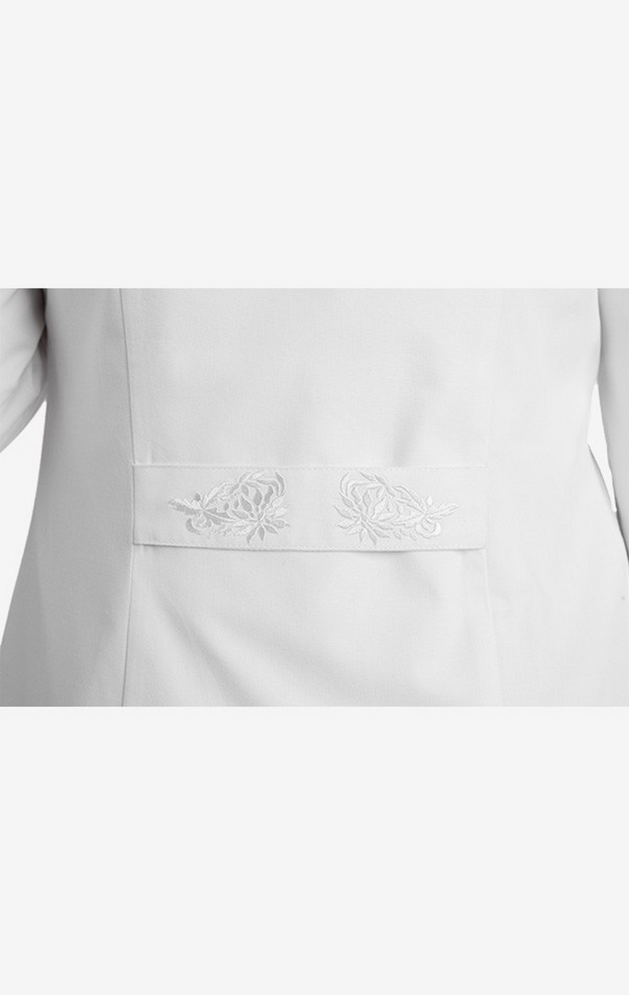Fabulous tailoring and embroidery make this lab coat fashionable and professional. 5oz lightweight coat with two lower pockets and embroidered belt detail in the back. Available in sizes XXS to 2XL. Fabric is poly/cotton 65/35.