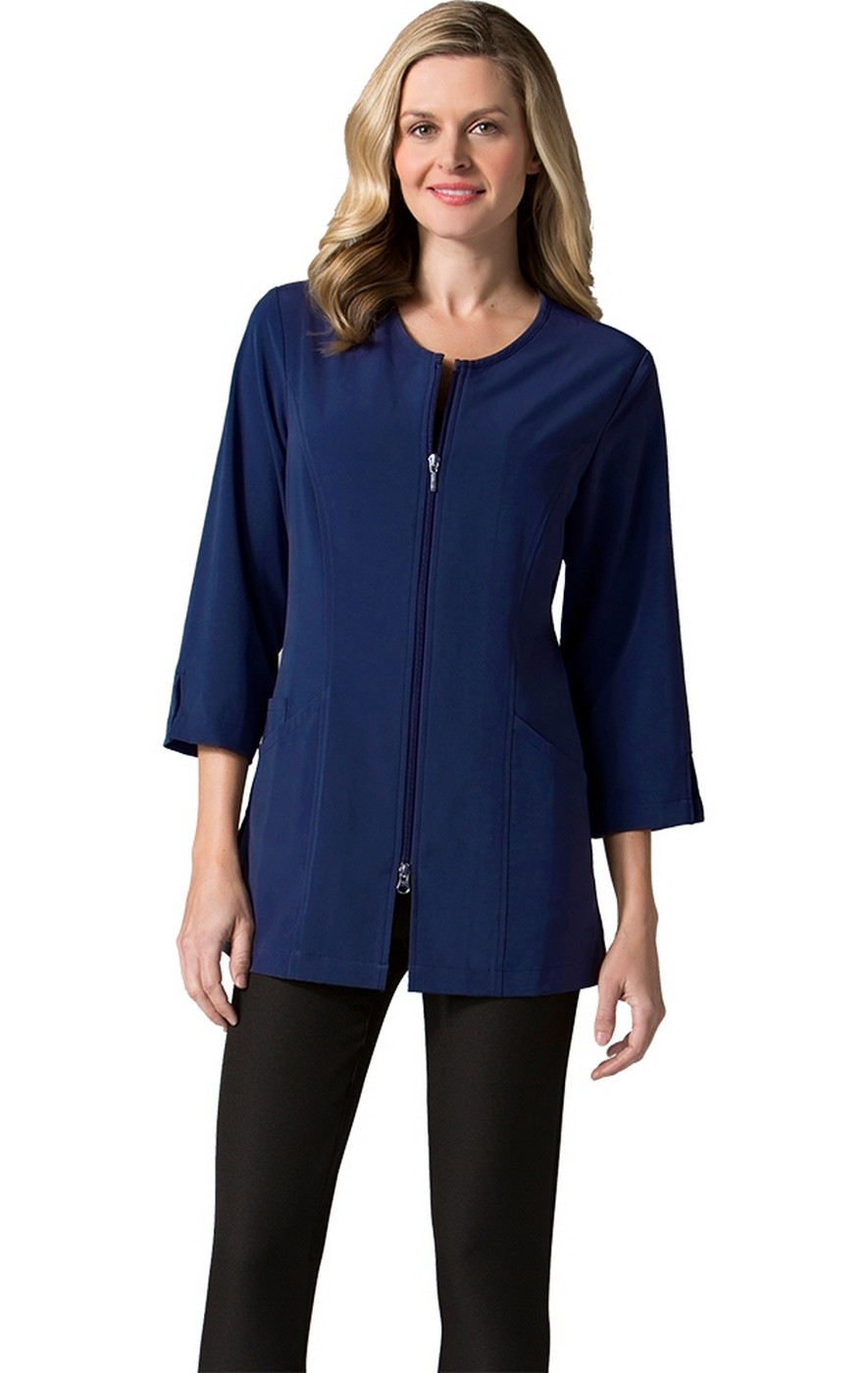 Rounded-neck line and 3/4” sleeve with slit. Body Shaping seams with front double side zipper. Two front curved pockets with cell pocket. Back darts and back waist belt for added shape and style. Side vents. SIZES: XXS - 4XL. LENGTH: 29.5”. FABRIC: 96% Polyester 4% Spandex.