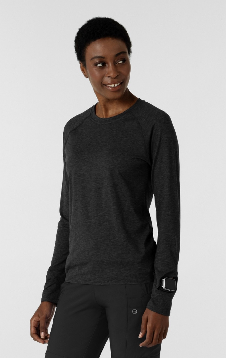 Check the time, track your steps, see if anyone called or texted — it's all possible with this women's scrub top. The design features an opening on each sleeve near the wrist so you can easily take a peek at your smart watch during your shift without missing a beat or an important moment. The window is built into both sleeves, so whichever side you find most convenient to wear your watch works perfectly. Stay comfortable for hours in the super soft fabric, which creates the perfect layer over a short-sleeve scrub top or all on its own. You'll enjoy freedom of movement and a flexible range of motion thanks to raglan sleeves that have extra give at the elbow. The simple crewneck silhouette creates a streamlined look that's polished and professional for your best presentation. The finishing touch: a Wink logo that reflects the light and reminds you of all the wonders you work.