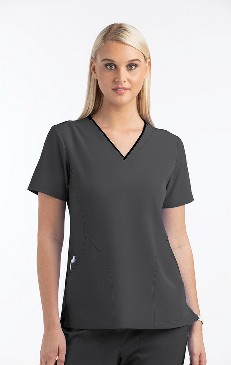 - Women’s V-neck top with contrast/DTM back neck band