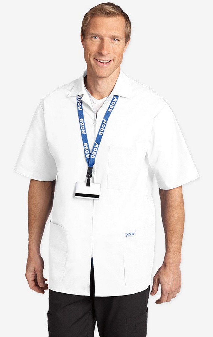 The look of lab coat and the feel of a scrub top. The unisex zip-up consultation jacket is the perfect choice for medical professionals. Featuring short sleeves, a full zipper front closure and 3 patch pockets. This top mates perfectly with all MOBB pants. Available in sizes XS to 2XL. Fabric is poly/cotton 65/35.