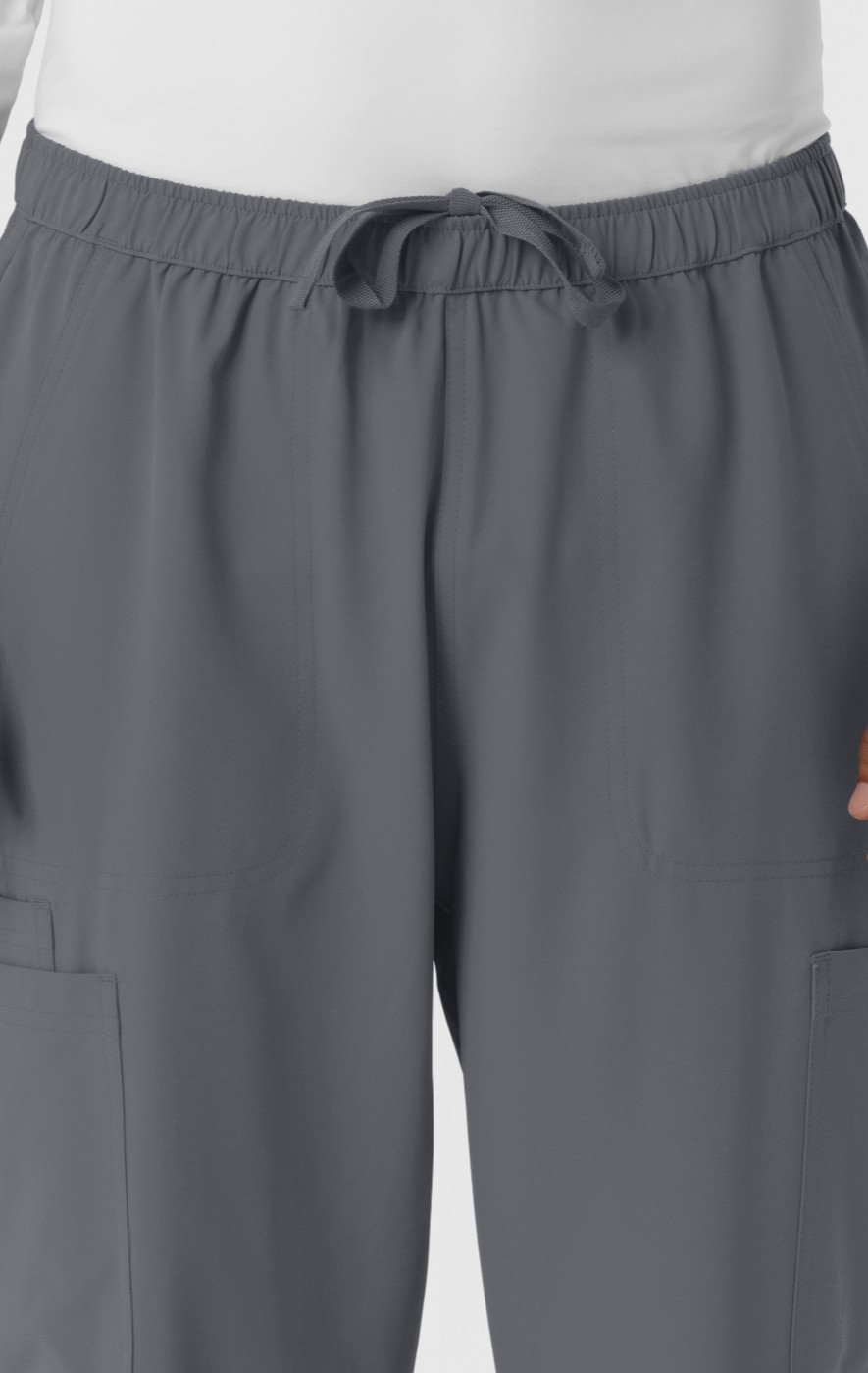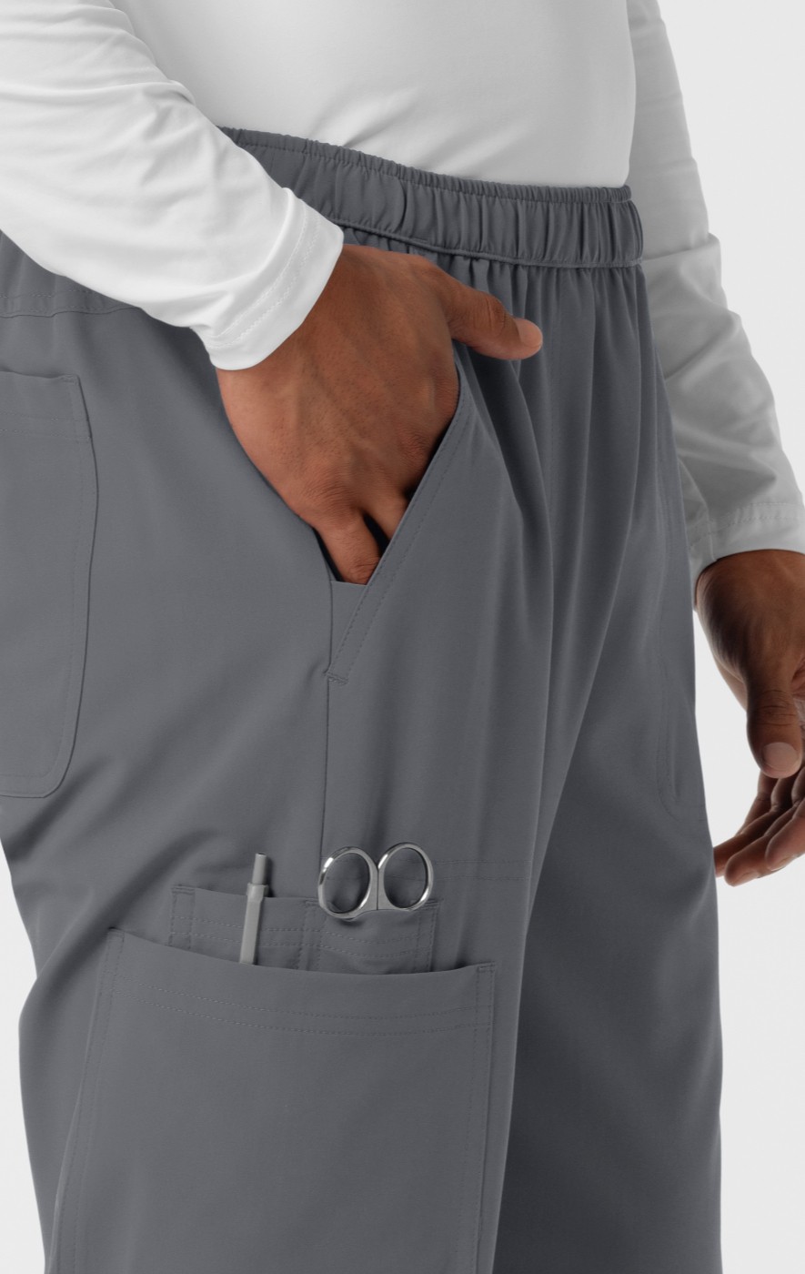 These men's scrub pants seamlessly blend comfort, functionality, and contemporary style. Crafted from a stretchy fabric that includes recycled polyester, they offer a sustainable and flexible option for your workday. The design incorporates denim-inspired back yoke seams, adding a touch of casual sophistication to your professional attire. The straight leg design ensures a classic, versatile look that complements a range of body types, while the comfortable fit allows for unrestricted movement throughout your busy shift. Practicality takes center stage with a grand total of seven pockets strategically placed for maximum utility. This includes multiple cargo pockets perfect for larger items, a dedicated cell phone pocket, and traditional front and back pockets. These pants are designed to help you efficiently manage your daily essentials, keeping you organized and prepared. With their combination of comfort, style, and thoughtful design, these scrub pants are a valuable asset for any healthcare professional.