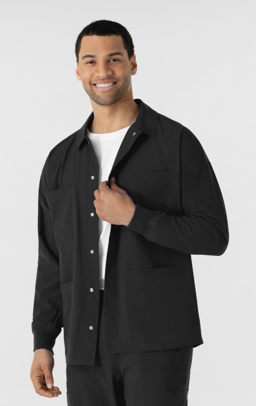 This men's scrub jacket is designed to seamlessly integrate with your existing scrubs, adding a layer of versatile functionality to your work wardrobe. Crafted from a crisp poplin material, it offers a polished and professional look that complements your scrubs while providing added warmth and coverage. The jacket features hidden snap buttons for easy on and off, allowing for quick adjustments throughout your busy day. Practicality is a key focus, with four front patch pockets providing ample storage for essential tools, notes, and personal items. These pockets are strategically placed for easy access, ensuring you can quickly retrieve what you need without disrupting your workflow. The crisp poplin fabric provides a polished look, while the hidden snap buttons and multiple pockets enhance convenience and practicality. Whether you're navigating a chilly facility or simply need an extra layer of warmth, this jacket is a reliable and stylish choice.