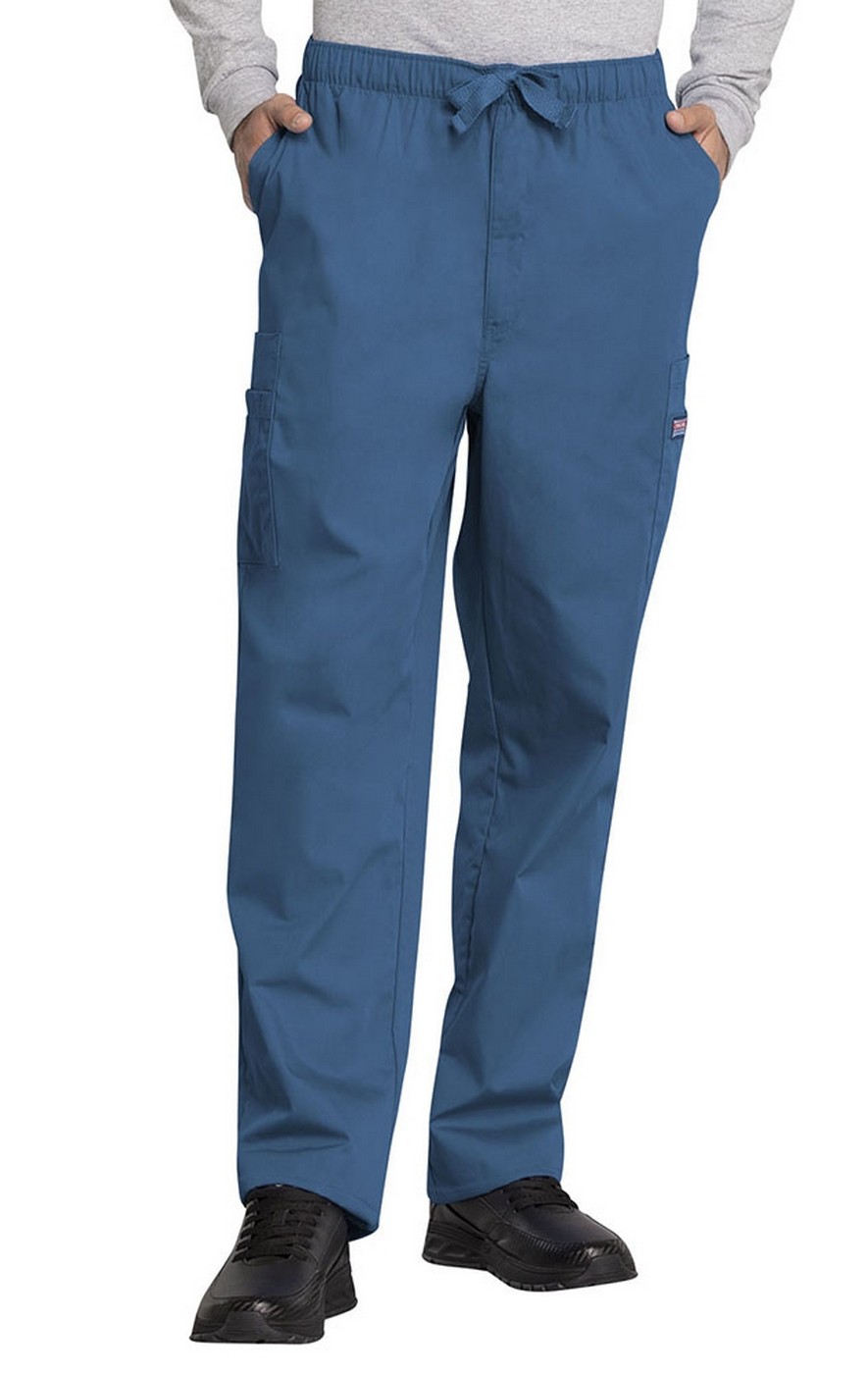 A Men's Traditional fit natural rise, elastic waist pant with webbed drawstring also features a functional zip fly, four side cargo pockets, front angled pockets and a back patch pocket.