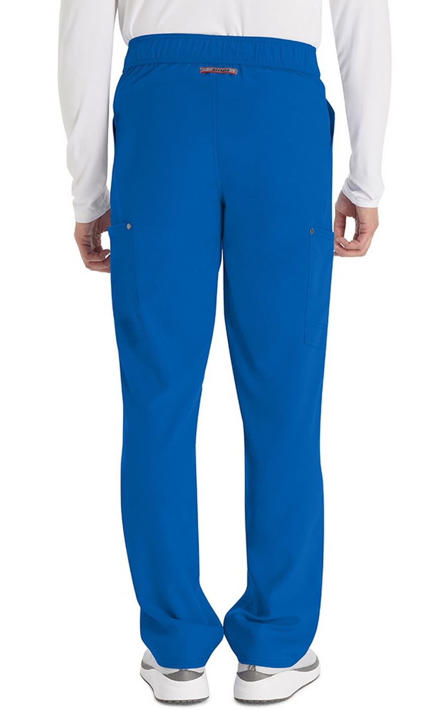 This Men's fit mid rise pant has an elastic-reinforced waistband with inside logo drawstring for adjustability and security. Pull-on waist with zip fly and logo snap closure. There are four pockets for easy storage: two front slant pockets and two cargo pockets with decorative stitching (right with pen/instrument stitch). Cargo pockets have decorative logo snaps at corners. Decorative knee stitching and decorative stitching on all seams for added styling. Logo locker loop at center back waist for quick hanging.