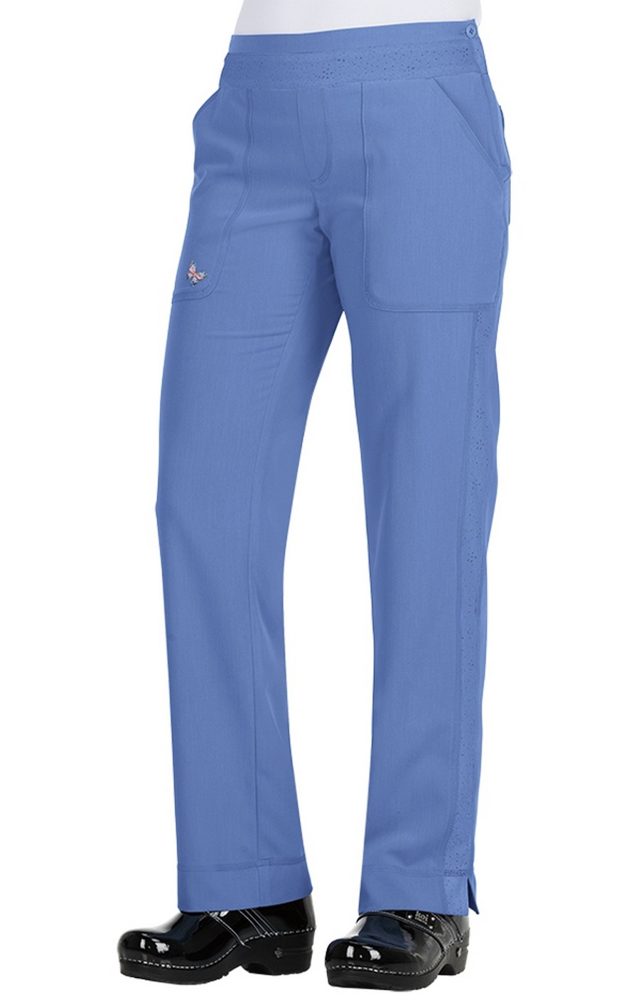 The Koi Mariposa Maddi Scrub Pants have everything you could ever want in a scrub pant! These yoga style pants are made with an elastic waist and stretch fabric that keeps up with your active workday. Four pockets provide plenty of options to store instruments and accessories. A side zipper, slits at the hem, and floral laser-cut detail at the waist and side panels rounds out the look.