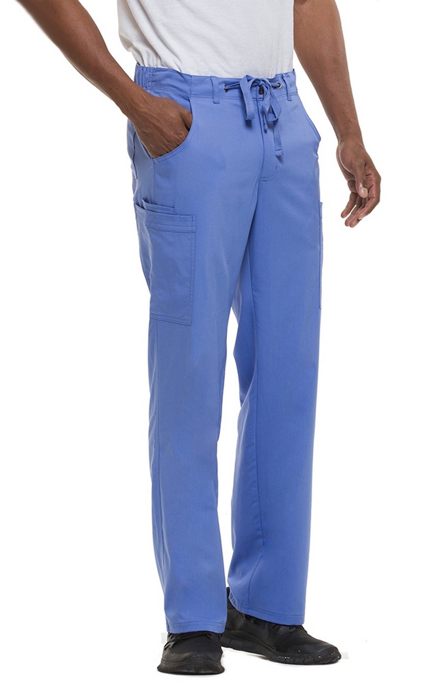 Healing Hands Purple Label Dylan cargo pants for men has a zipper front with a working button, a back elastic waist with flat front, and a twill drawstring tie. For storage, there are 6 pockets in total: 2 front side pockets, 1 right double cargo pocket, 1 left cargo pocket, and 1 back pocket with Velcro to keep your instruments secure. These pants sit at the waist and have straight legs.