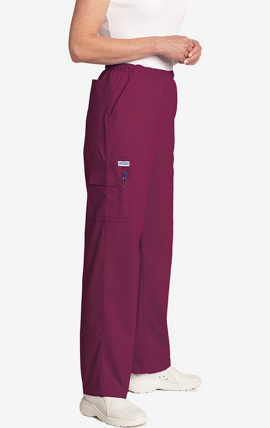 This MOBB unisex style is made to fit everyone looking for a sensible scrub pant. Features a combination drawstring and elastic waistband and a slimming cut ankle. The two slash pockets located at the top of MOBB's bestselling scrub pant complement the two lower side cargo pockets. The left cargo pocket divides and conquers all, including a secure Velcro flap compartment and pen/scissor pockets. One back pocket. Length is 32". Fabric is poly/cotton 65/35. Sizing XXS to 5XL. Matches all MOBB top colors. Size 5XL available only in Black and Navy.