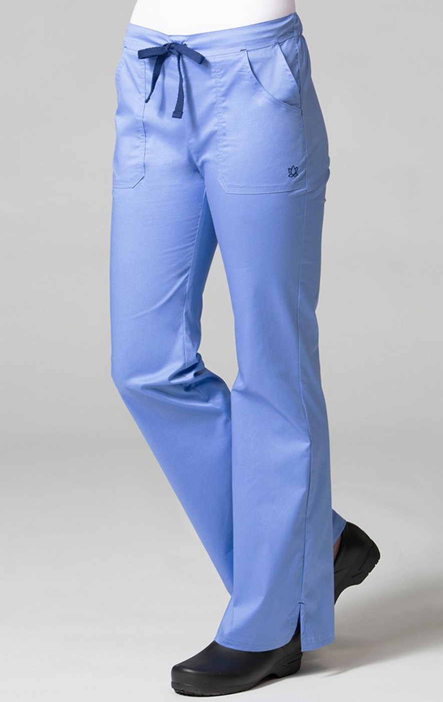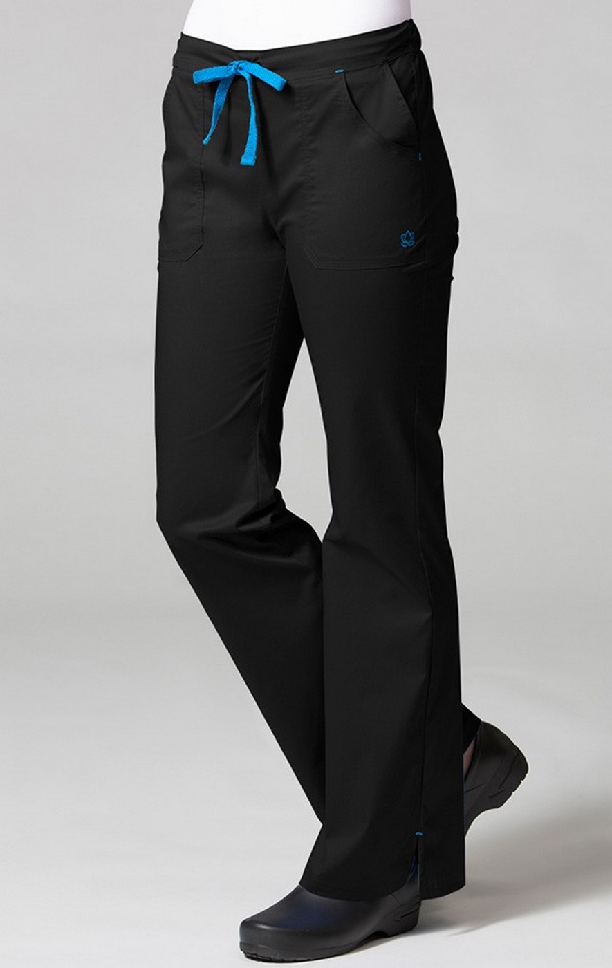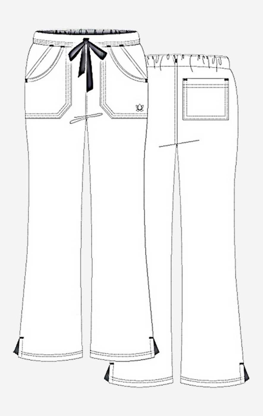 Designed with our signature stretch fabric that is soft to the touch, yet crisp and professional. Fashion flare pant with back elastic waist. Triple stitching at waist and pockets. Four front slash pockets and one back pocket. High quality contrast colored twill tape drawstring. Contrast bartacks at all pressure point. Vented hems for added mobility. SIZES: XS - 2XL. INSEAM: Petite: 28". FABRIC: 52% Cotton 45% Polyester 3% Spandex.