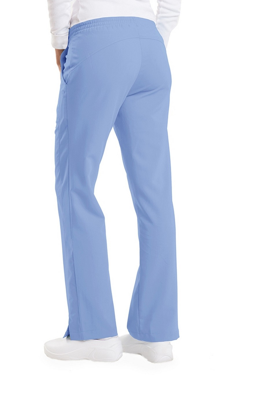 Healing Hands 9095 Junior fit drawstring pant features a mid-rise fit with boot cut legs. This pant has a flat front grommet detail on the drawstring for ease of adjustment. The front features a slimming wrap design which adds no bulk at the sides. There is a wide comfort elastic waistband in the back that stays secure, along with a back yoke detail for a sleek fit. There are two side pockets for storage and side slits for easy access. A dyed to match twill tape drawstring, top stitching detail and a "healing hands" embroidered logo on the pockets complete Healing Hands Taylor Pant. Fabric is 77/20/3 Poly/Rayon/Spandex. The inseam for Petite Length 28".