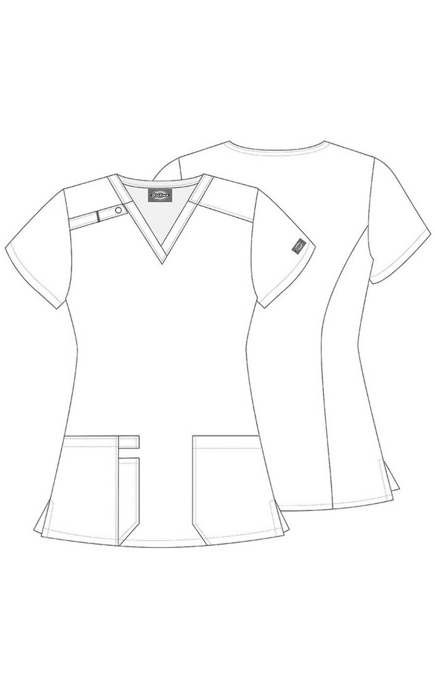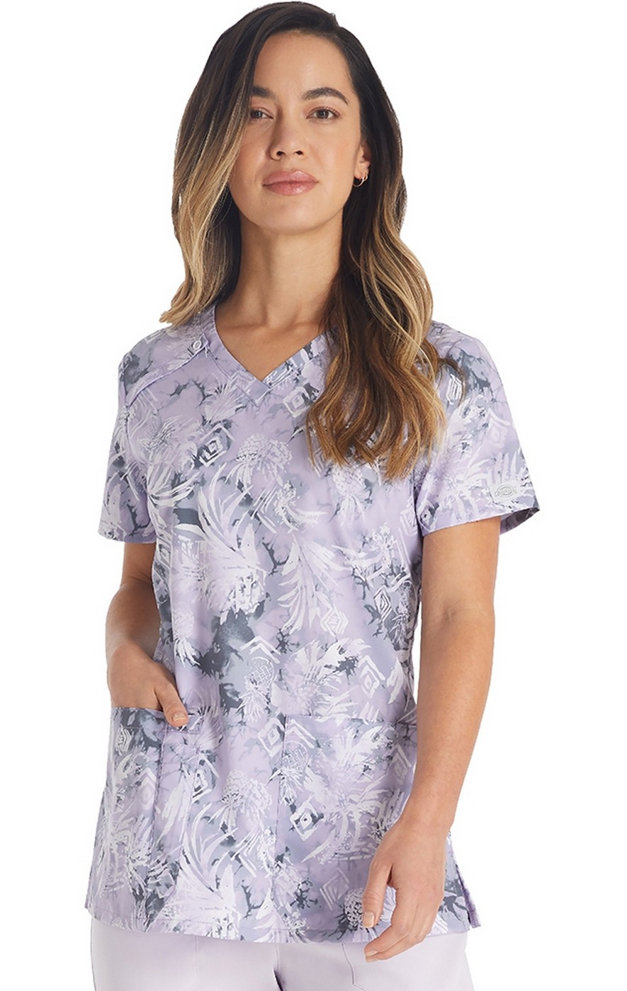 This form-flattering V-neck print top features instrument loops and a snap tab at the wearer's right shoulder plus back princess seams. There are two front patch pockets, a pen pocket and a self instrument loop above the pen pocket for storage. It also includes side vents for comfort and ease of movement.