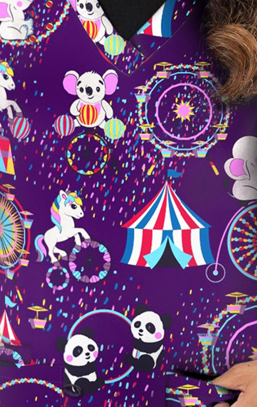*FINAL SALE 1465PL – BIG CIRCUS PURPLE Print Scrub Top - Soft Stretch Zinnia Fabric by Greentown