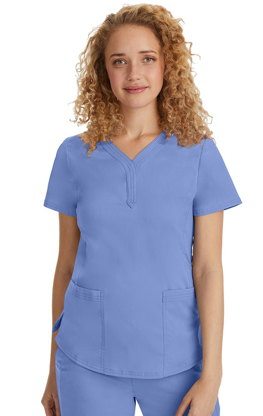 The flattering Jane top from Healing Hands features a "Y" shaped neckline and triple needle stitching on the neckline and pockets. For a superior fit, there is front seam and side slits. A shirt tail hem and a Healing Hands embroidery logo on left front pocket complete this modern fit scrub top.
