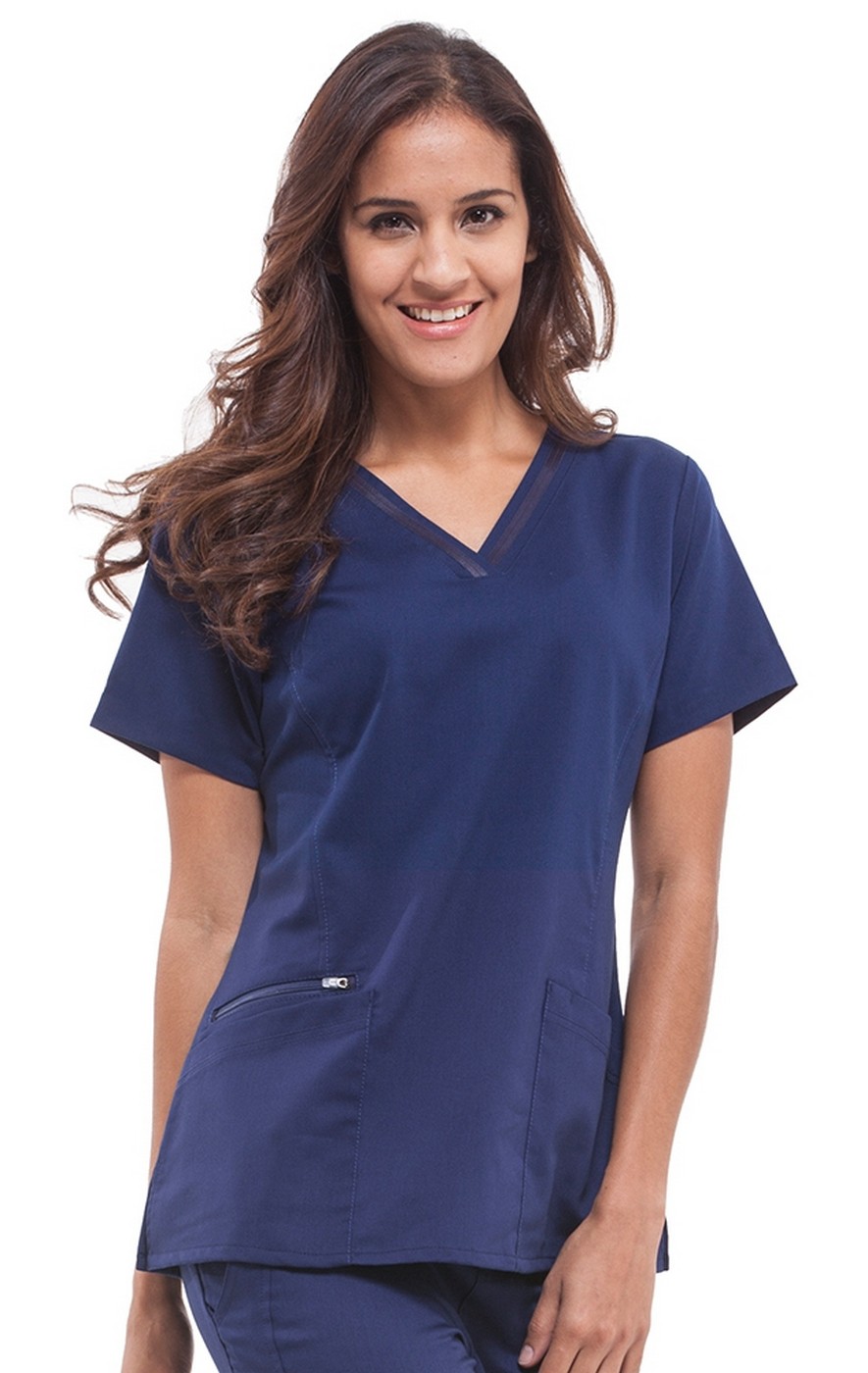 The Jasmin Fashion v-neck scrub top is made with comfortable stretch fabric that feels amazing to wear throughout your busy workday. Two spacious lower pockets and a convenient cell phone pocket give you plenty of room to store pens, keys, instruments, and more. For storage, you will find 2 front angled pockets, 1 additional hidden pocket with zipper closure, and 1 pen slot. Side slits give you ease of movement.