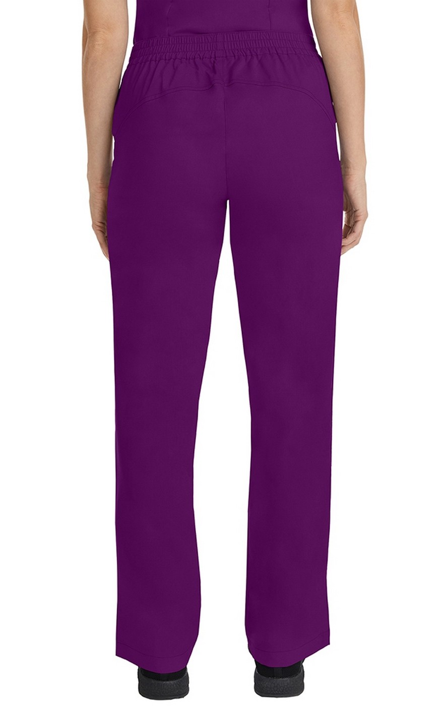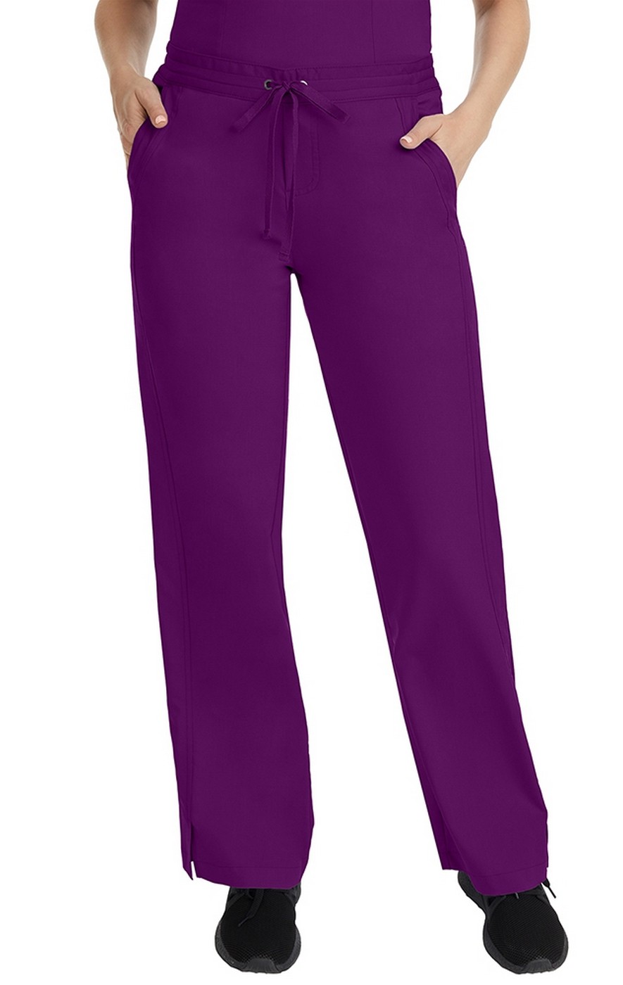 Healing Hands Taylor drawstring pant features a mid-rise fit with boot cut legs. This pant has a flat front grommet detail on the drawstring for ease of adjustment. The front features a slimming wrap design which adds no bulk at the sides. There is a wide comfort elastic waistband in the back that stays secure, along with a back yoke detail for a sleek fit. There are two side pockets for storage and side slits for easy access. A dyed to match twill tape drawstring, top stitching detail and a "Healing Hands" embroidered logo on the pockets complete the look.