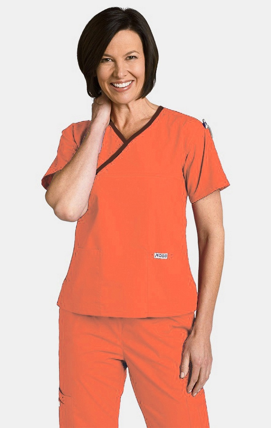 Crossover to MOBB!. The bestselling crossover scrub set in Canada is the MOBB Criss Cross Flip Flap scrub set. THE TOP: Features a V-neck with a contrast color trim as well as two lower pockets and one shoulder pen pocket. THE PANT: Fabulous fit and classic style. This five-pocket boot cut pant features our signature MOBB logo waistband that can be flipped down for a lower rise. Fabric is 65/35 Poly/Cotton.