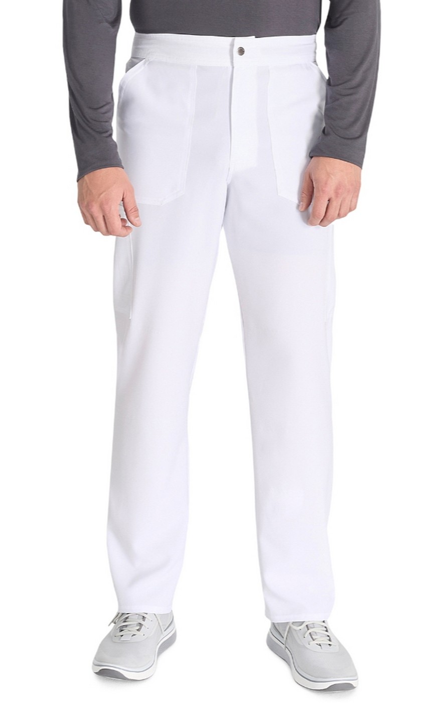 This Men's fit mid rise pant has an elastic-reinforced waistband with inside logo drawstring for adjustability and security. Pull-on waist with zip fly and logo snap closure. There are four pockets for easy storage: two front slant pockets and two cargo pockets with decorative stitching (right with pen/instrument stitch). Cargo pockets have decorative logo snaps at corners. Decorative knee stitching and decorative stitching on all seams for added styling. Logo locker loop at center back waist for quick hanging.