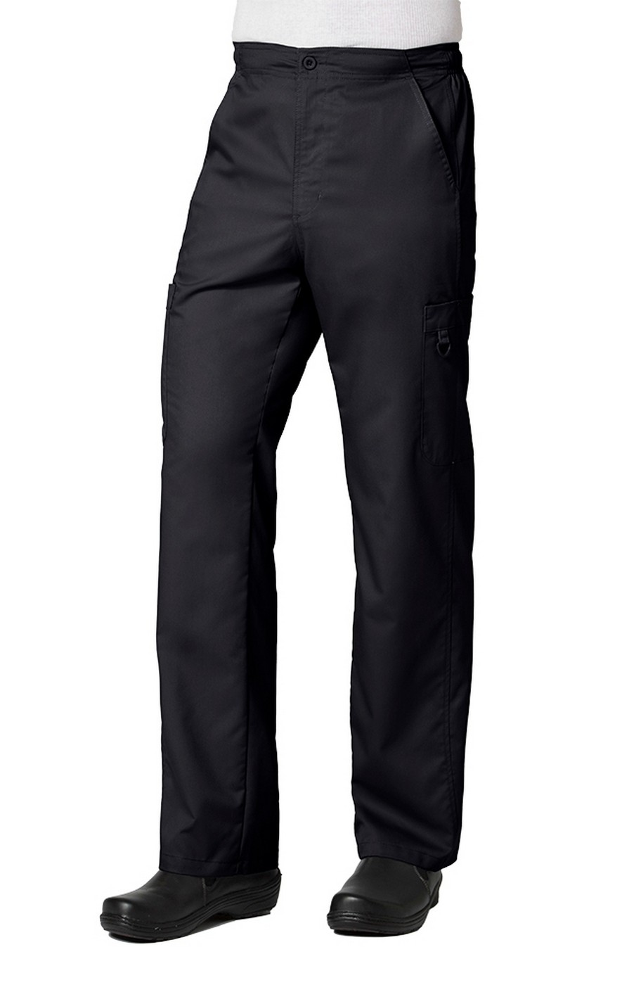 The Maevn EON 8308 men's cargo scrub pant sits at the waist and features a drawstring, elastic back, and functional zipper fly. For maximum storage, there are 8 pockets total: 2 front slant pockets, 2 cargo pockets, 1 mesh pocket, and 2 back pockets. In addition, you will find 1 pen slot with a triangle ring.