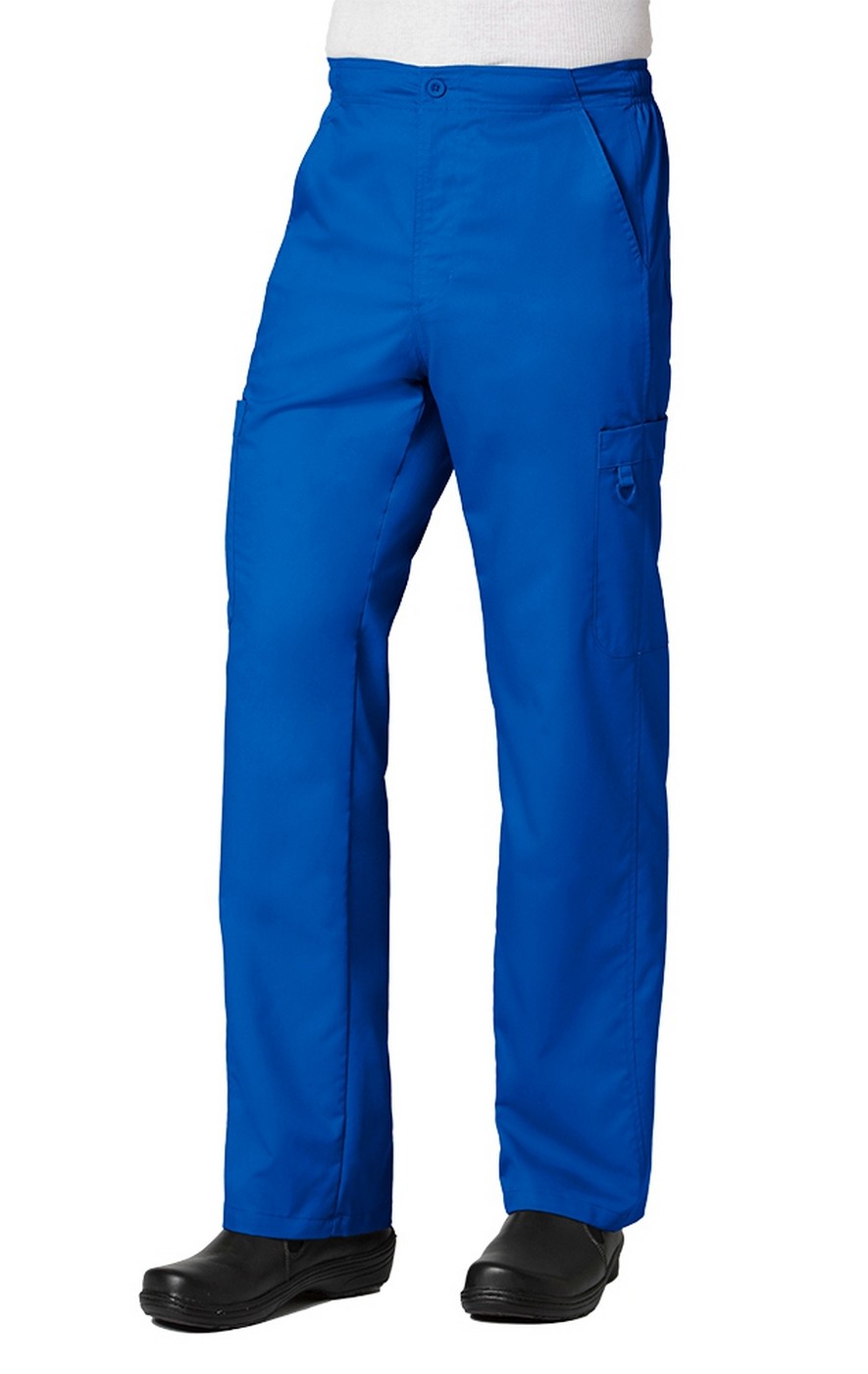 The Maevn EON 8308 men's cargo scrub pant sits at the waist and features a drawstring, elastic back, and functional zipper fly. For maximum storage, there are 8 pockets total: 2 front slant pockets, 2 cargo pockets, 1 mesh pocket, and 2 back pockets. In addition, you will find 1 pen slot with a triangle ring.
