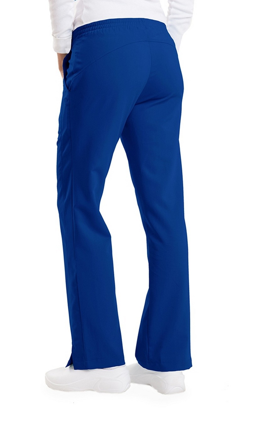 Healing Hands 9095 Junior fit drawstring pant features a mid-rise fit with boot cut legs. This pant has a flat front grommet detail on the drawstring for ease of adjustment. The front features a slimming wrap design which adds no bulk at the sides. There is a wide comfort elastic waistband in the back that stays secure, along with a back yoke detail for a sleek fit. There are two side pockets for storage and side slits for easy access. A dyed to match twill tape drawstring, top stitching detail and a "healing hands" embroidered logo on the pockets complete Healing Hands Taylor Pant. Fabric is 77/20/3 Poly/Rayon/Spandex. The inseam for Tall Length 33".