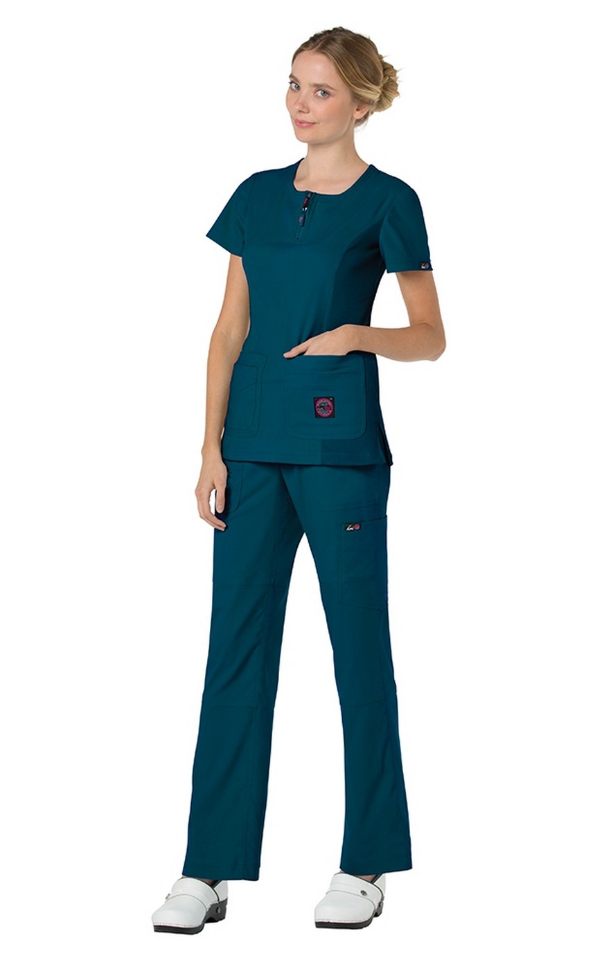 Koi Lite™ Scrubs 317 Serenity Double Zipper top features a contrast double zipper and rib knit trim at sides. Front and back princess seams give this top a flattering fit. Two front double patch pockets with Koi logo patch on the left outside pocket makes this top a storage lover's dream. Side slits allow for ease of movement. Wrinkle free, moisture wicking performance stretch fabric is 100% polyester dobby stretch and rib trim 92/8 poly/spandex. The approximate length for size M is 27.5"