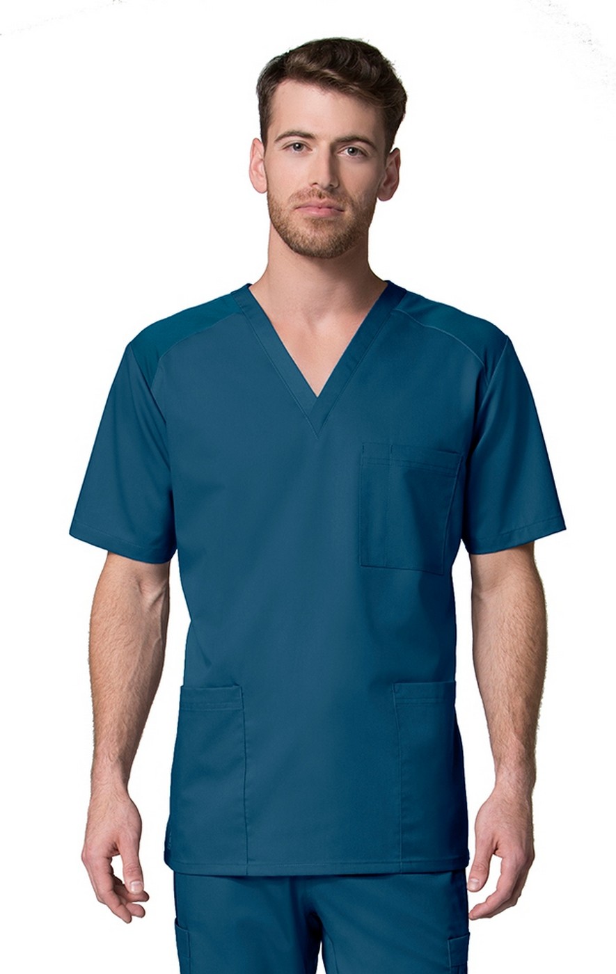 The Maevn EON 5308 men's scrub top features a v-neckline and curved mesh panels along the shoulders and back of neck. For storage, you will find one chest pocket with a pen slot, two front patch pockets, and one additional hidden inner pocket. The side slits provide easy mobility around the workplace. Fabric is 59/22/19 polyester/rayon/elasterell-p.