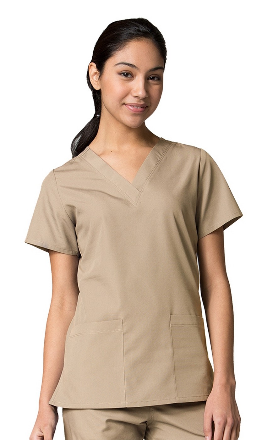 Basic V-neck top. Two front patch pockets. Double needle stitching at shoulder and pocket. Inner utility loop at pocket. Side vents.