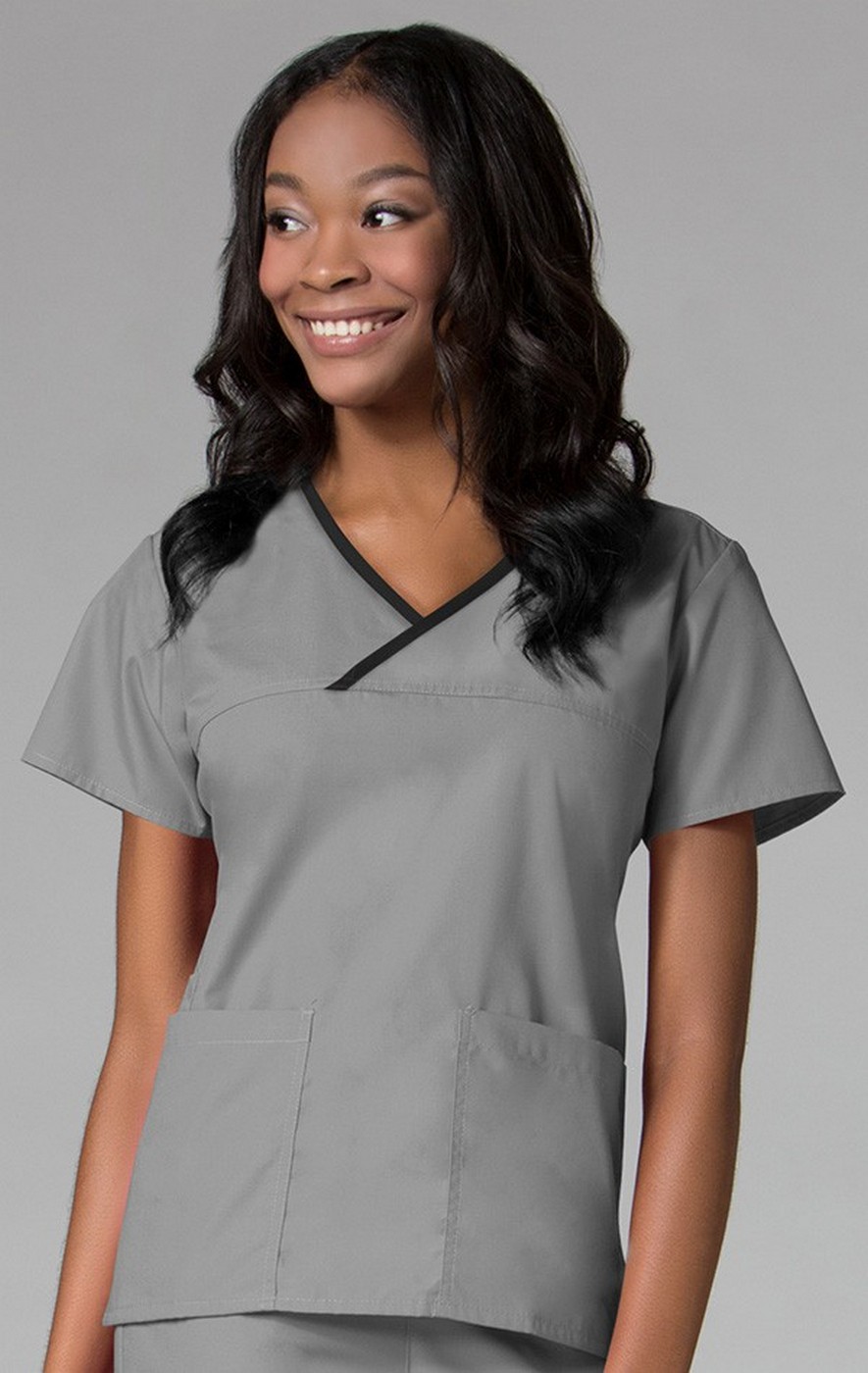 Constructed with Maevn's superior plain weave poplin fabric. Mock wrap top with contrast detailing. Two lower pockets and one elevated smart phone pocket. Double stitched at shoulders,front yoke seam and front pockets for durability. Set in sleeves for mobility. Inner utility tape at front pocket. Tagless for added comfort. SIZES: XXS - 5XL. LENGTH: 26 1/4". FABRIC: 65% Polyester 35% Cotton.