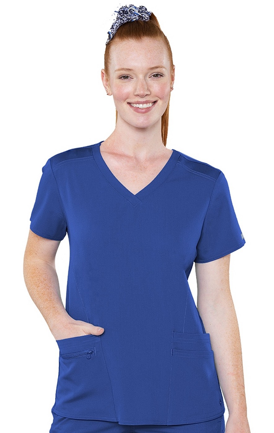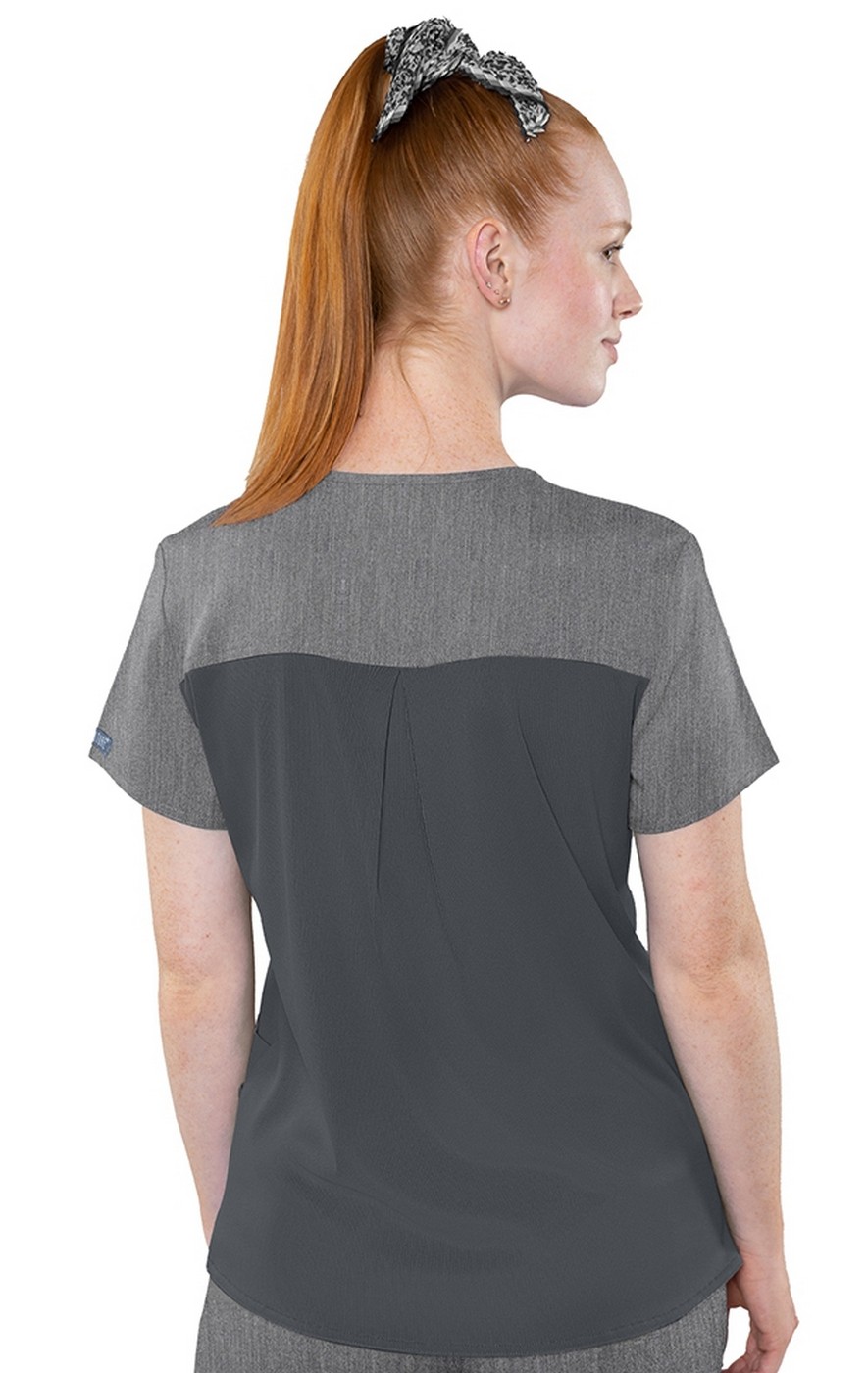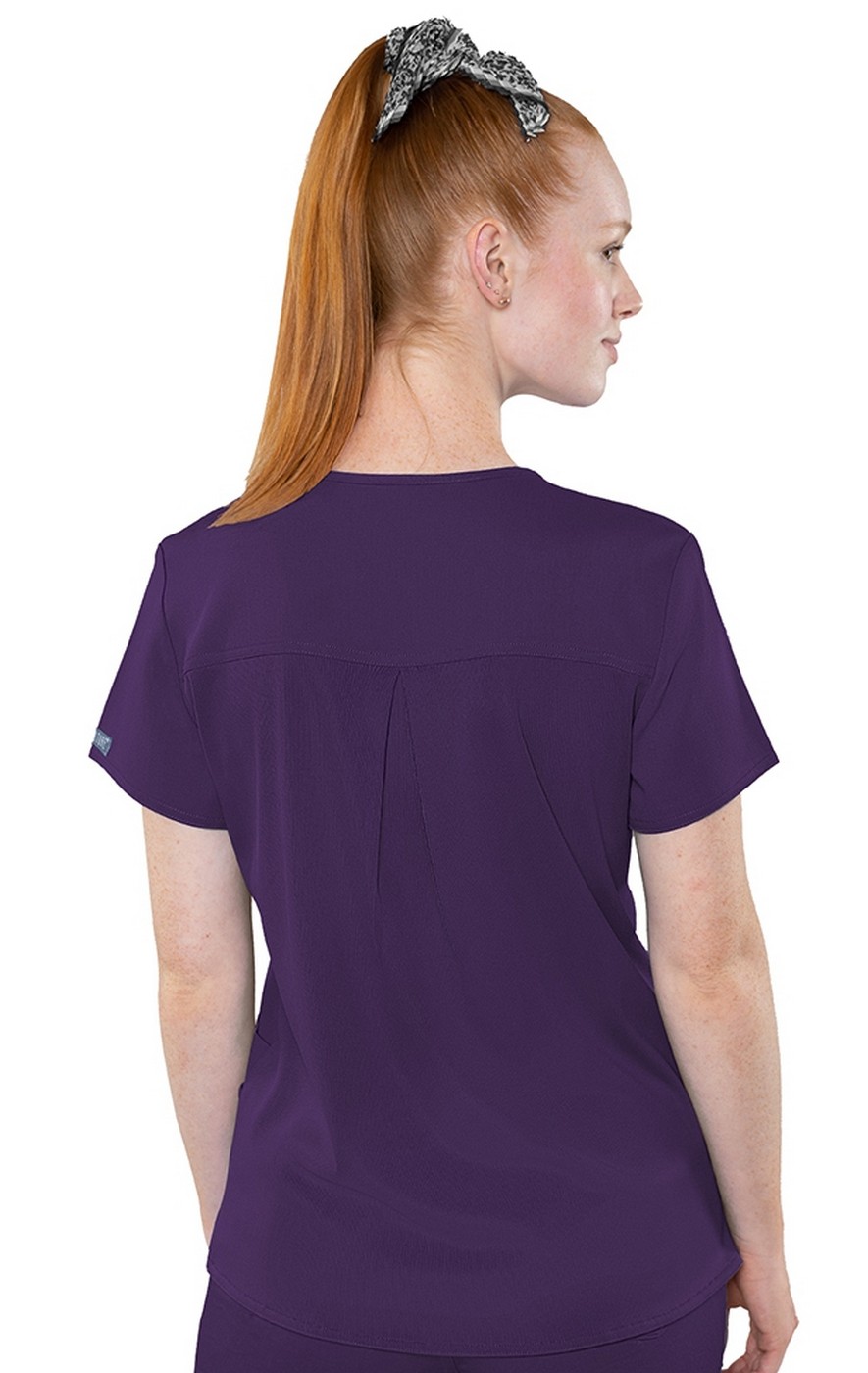 Everything you'd expect in a great scrub top with layered pockets for versatile storage AND an entire knit back, giving you combined comfort and breathability!