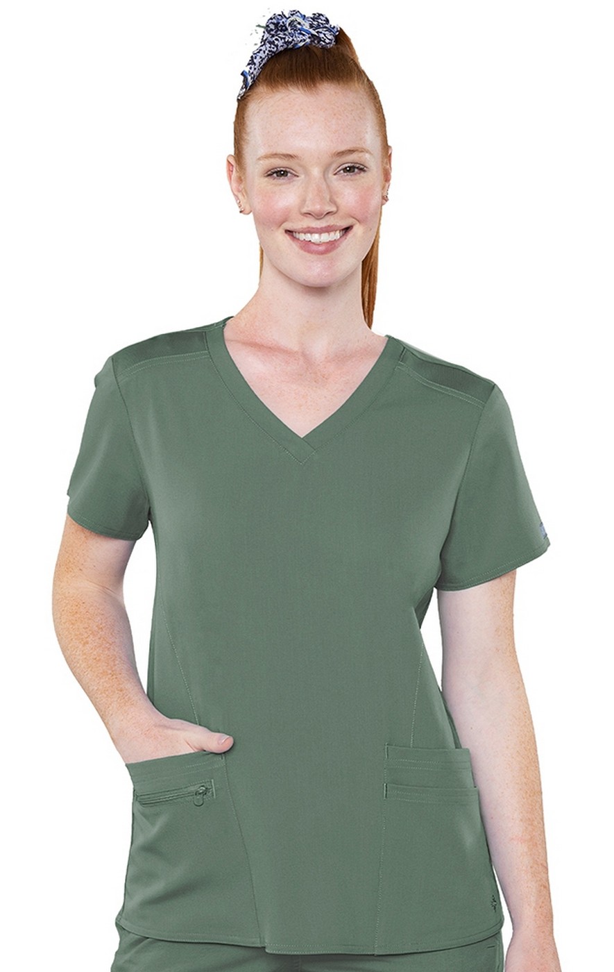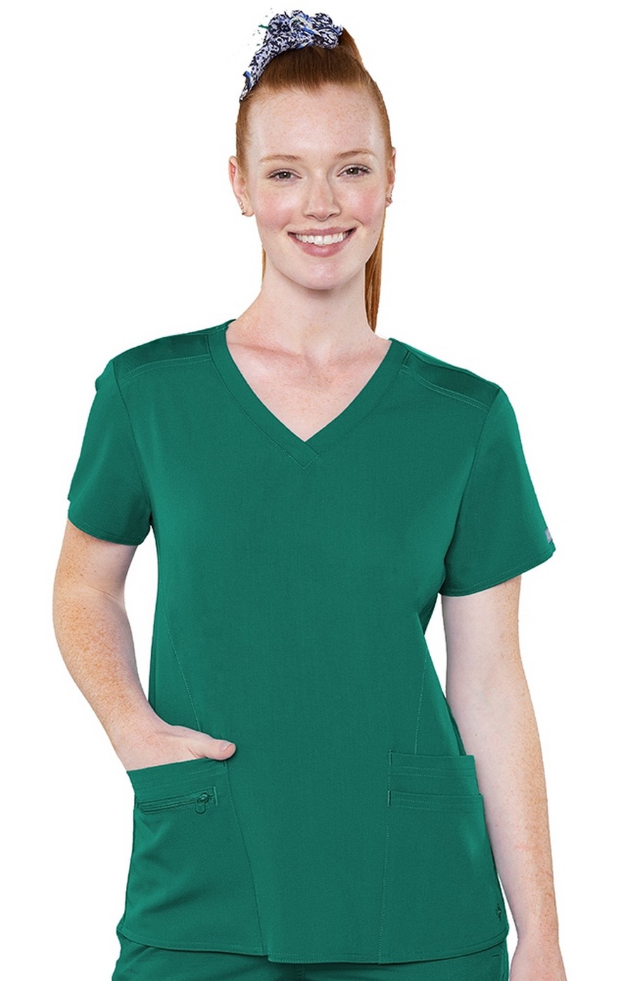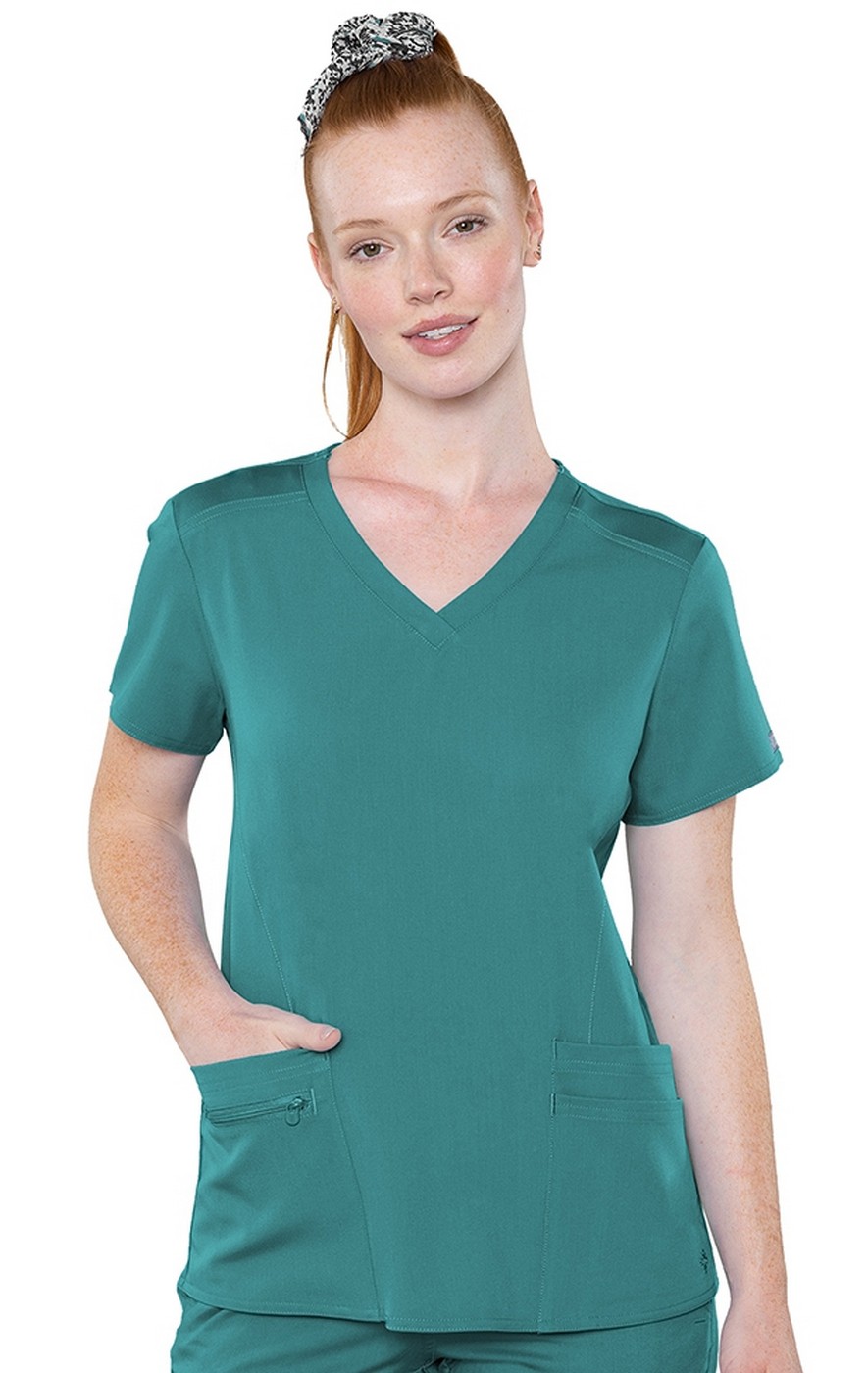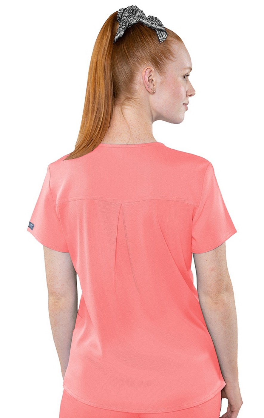 Everything you'd expect in a great scrub top with layered pockets for versatile storage AND an entire knit back, giving you combined comfort and breathability!