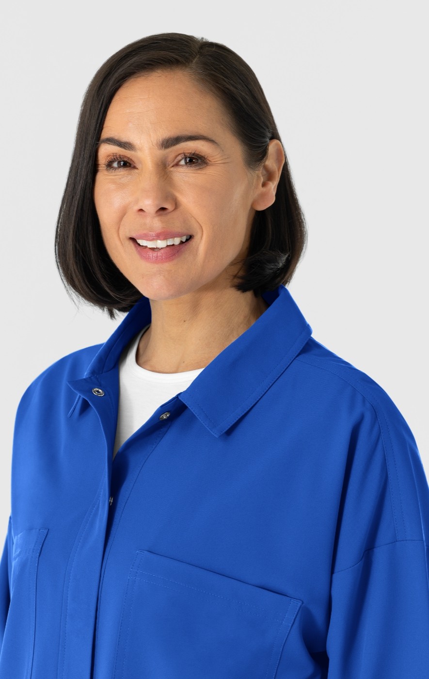 This women's scrub jacket is designed to seamlessly integrate with your existing scrubs, adding a layer of versatile functionality to your work wardrobe. Crafted from a crisp poplin material, it offers a polished and professional look that complements your scrubs while providing added warmth and coverage. The jacket features hidden snap buttons for easy on and off, allowing for quick adjustments throughout your busy day. Practicality is a key focus, with four front patch pockets providing ample storage for essential tools, notes, and personal items. These pockets are strategically placed for easy access, ensuring you can quickly retrieve what you need without disrupting your workflow. The crisp poplin fabric provides a polished look, while the hidden snap buttons and multiple pockets enhance convenience and practicality. Whether you're navigating a chilly facility or simply need an extra layer of warmth, this jacket is a reliable and stylish choice.